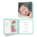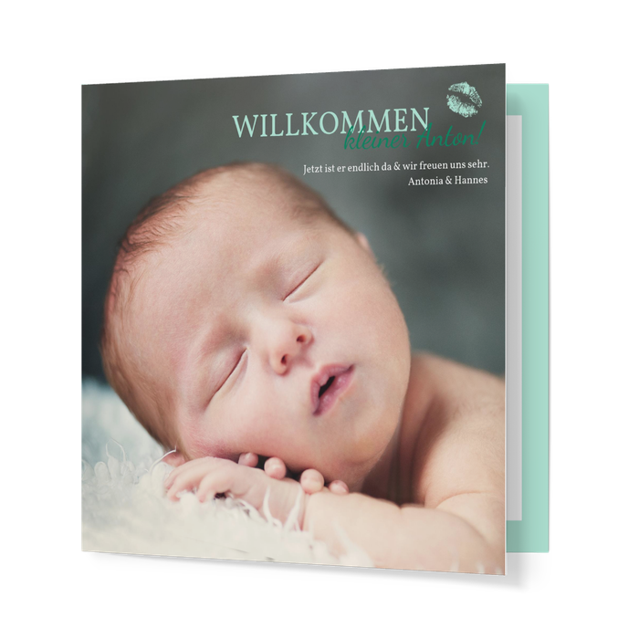 Lange haben Sie auf diesen Tag gewartet, nun ist er endlich da! Sie halten Ihren kleinen Sohn in Ihren Armen und möchten ihn nie mehr hergeben. Aber natürlich wollen auch Freunde und Verwandte den kleinen Kerl zu Gesicht bekommen. Mit dieser Fotokarte greifen Sie dem Ansturm vor und jeder hat so ein persönliches Foto Ihres kleinen Prinzen Zuhause! Das helle Mint verleiht der Karte einen Hauch von Leichtigkeit.
