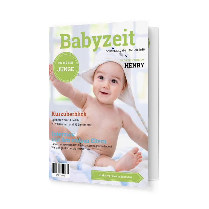 Gestalten Sie die Babykarte für Ihren Jungen in Form einer Zeitschrift mit dem Namen Babyzeit. Der kreativen Karte können die wichtigen Themen hinzu geschrieben und mit einem großen Cover-Foto gestaltet werden. Werden Sie Ihr eigener Redakteur und gestalten die Titelthemen für Ihr Baby.