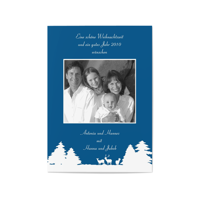 Versenden Sie Ihre besten Wünsche zur Weihnachtszeit mit dieser zauberhaften Weihnachtskarte mit Winterlandschaft. Ein passendes Foto Ihrer Familie macht diese Karte speziell und einzigartig. Mit ihr schicken Sie liebe Grüße zum Fest an Verwandten und Freunde, die an diesen besonderen Tagen nicht bei Ihnen sein können.