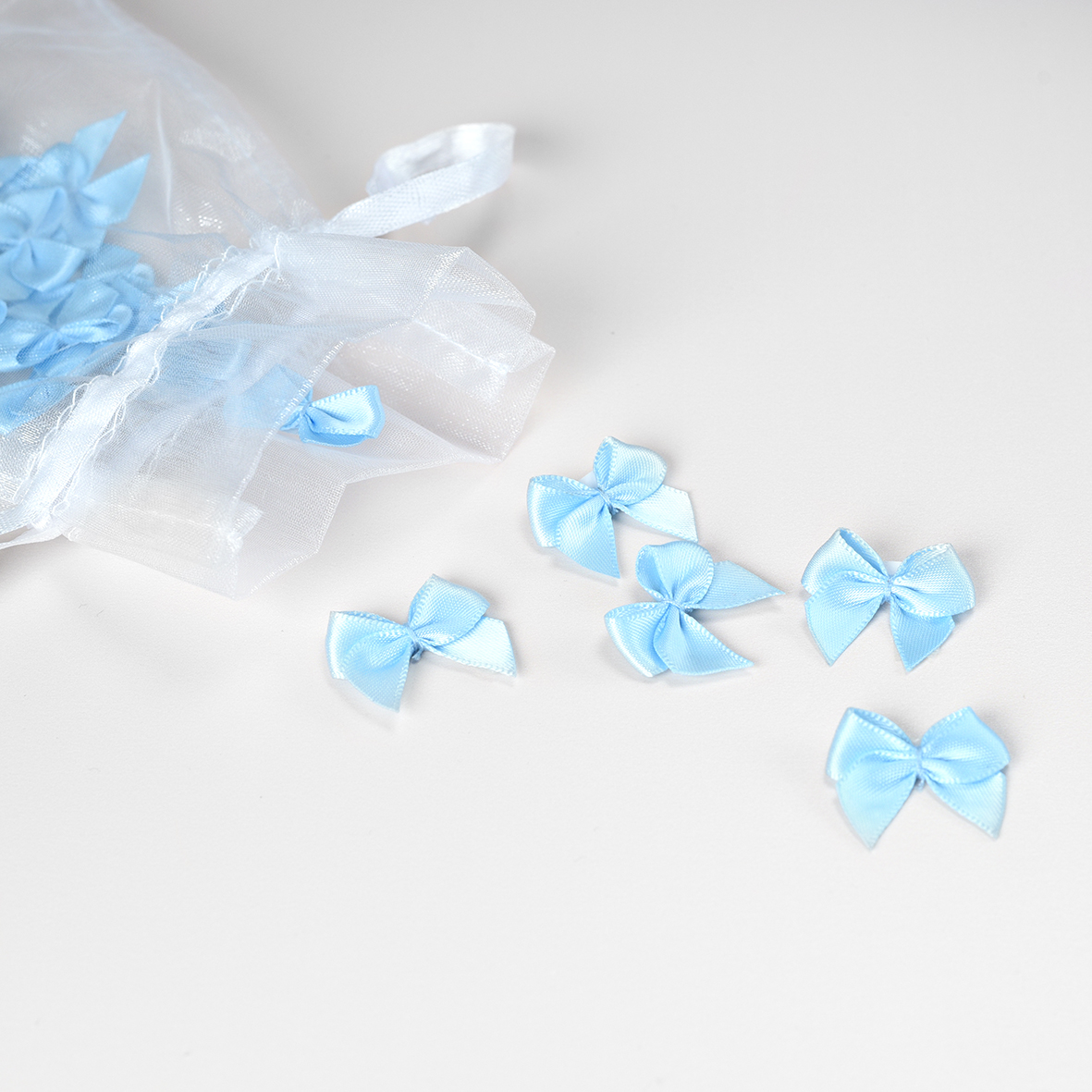 Blauwe satijnen strikjes met plakstrip (25 stuks). Formaat: 2,5 cm (breedte) x 2,5 cm (hoogte).