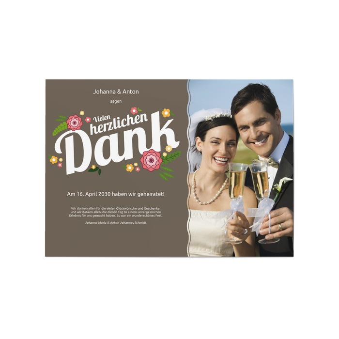 Ihre Hochzeit war der schönste Tag in Ihrem Leben? Dann bedanken Sie sich mit der zauberhaften Wunderkarte Blumenhochzeit bei all Ihren Gästen. Mit den schönsten Bildern des Tages machen Sie daraus eine schöne Erinnerung für Familie und Freunde.