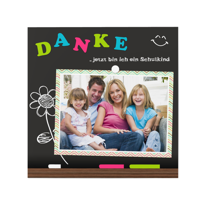 Diese Dankeskarte anlässlich der Einschulung Ihres Kleinen besticht durch ihre frische Aufmachung und versprüht Freude und Spaß. Damit auch die Gäste der Einschulungsparty lange etwas von dieser Freude haben, haben wir diese süßen schwarzen Dankeskarten mit einem lustigen Schultafelmotiv für Sie gestaltet.