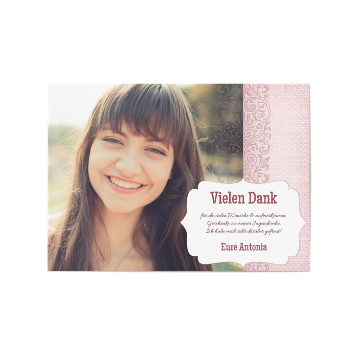 Die Jugendweihe liegt hinter Ihnen, nun sind Sie in die Gesellschaft der Erwachsenen aufgenommen worden. Natürlich möchten sie sich bei allen Menschen bedanken, die diesen Tag mit Ihnen gefeiert haben, und sie vielleicht auch mit kleineren oder großen Geschenken bedachten. Ein feierlicher Rahmen liegt auf einem zarten, gewebten Muster in hellen Rosatönen. Mit Ihren persönlichen Worten wird diese Karte sicher zu einer schönen Erinnerung.