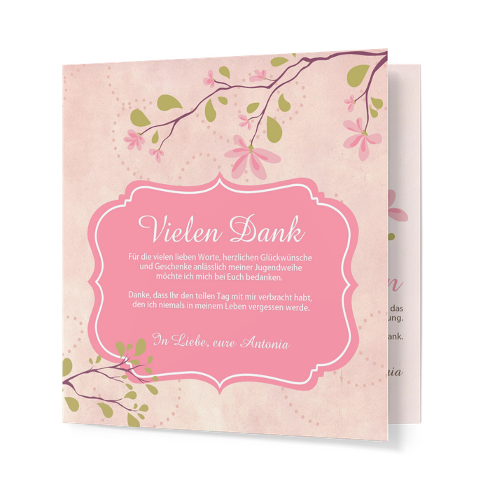 ür junge Frauen, die Ihren Gästen nach der Jugendweihe ein Dankeskarte schicken möchten, bietet sich diese Danksagungskarte mit einem Magnolienzweig und rosa Blüten an. Weiterhin haben sie die Möglichkeit, ein Foto auf der Innenseite zu platzieren.