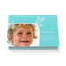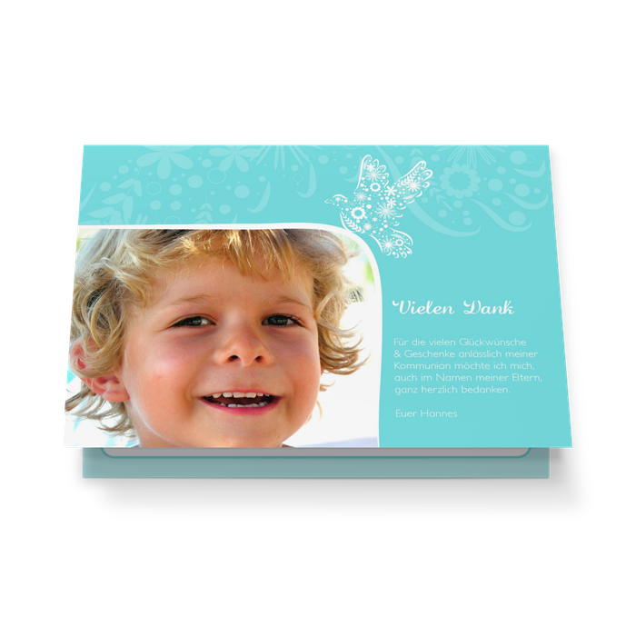 Auf einem Untergrund in Petrol fliegt ein Täubchen herein. Es ist geschaffen aus hübschen Blüten, und bringt ein Foto des fröhlichen Kommunionkindes mit. Ein paar persönliche Dankesworte bereiten sicher jedem der Gäste Freude, die mit vielen Glückwünschen und aufmerksamen Geschenken zum Fest kamen. Für sie ist diese Karte sicher ein hübsches Andenken an den gelungenen Tag.