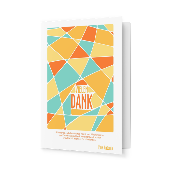 Sie lieben es ausgefallen, modern und trotzdem klassisch? Prima, dann haben Sie mit dieser Danksagung zur Konfirmation genau das Richtige gefunden. Ihr persönliches Wunschfoto und Ihr individueller Text werden eingerahmt in einer farbenfrohen Kirchenglas-Optik im Retro-Stil.