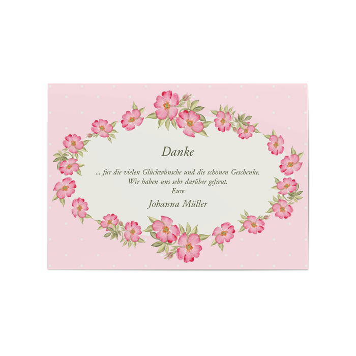 Sagen Sie mit einem ansprechenden Blumenmotiv Danke. Die Wildrosen auf dieser Karte umspielen Ihre Danksagung und wirken in Abstimmung mit dem zarten rosa des Hintergrundes sehr harmonisch. Für eine persönliche Danksagung gibt es viele Möglichkeiten. Ergreifen Sie diese jetzt mit dieser stilvollen Karte.