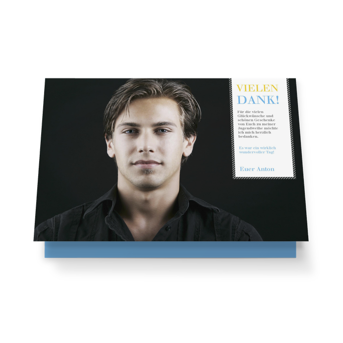 Die blaue Schrift der Dankeskarte für die Jugendweihe sticht hervor und fällt sofort auf. In Kombination mit einem herzlichen Spruch handelt es sich hier um die perfekte Dankeskarte.