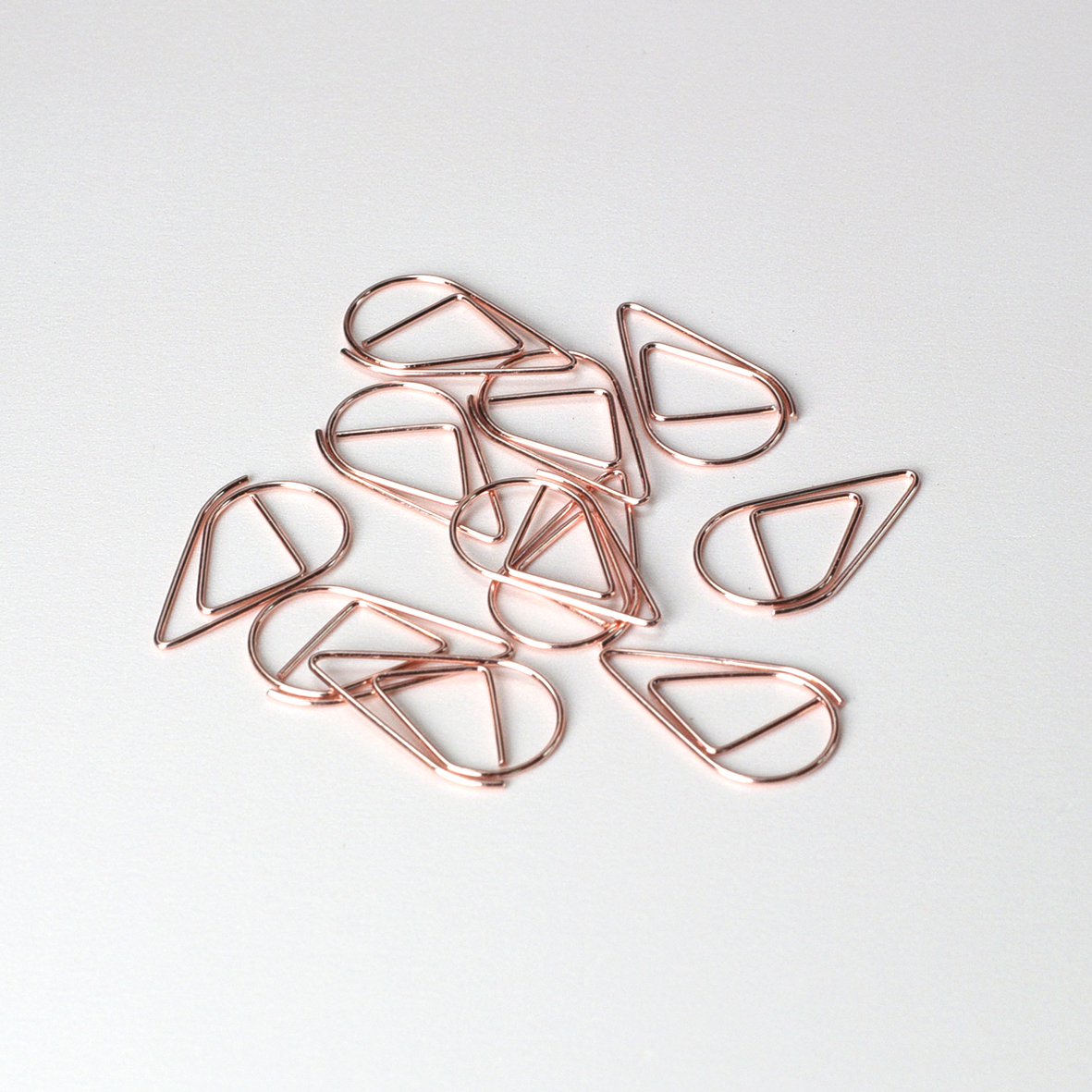 Druppelvormige, roségouden paperclips (25 stuks). Formaat: 1,5 cm (breedte) x 2,7 cm (lengte).