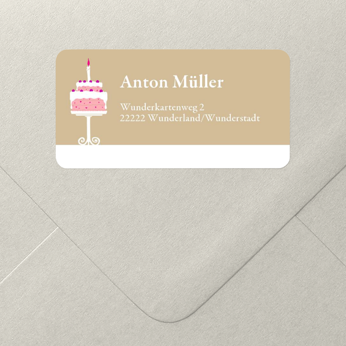 Der Adressaufkleber beherbergt eine Torte in Bronze um genau auf die dafür zugeschnittene Einladung zum Geburtstag zugeschnitten zu sein.