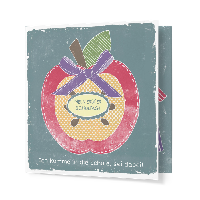 Ein lustiger, bunter Apfel leuchtet allen entgegen, die diese zauberhafte Wunderkarte Bald ein Schulkind erhalten. Diese tolle Einladung zum 1. Schultag kommt bei allen Verwandten und Freunden bestens an – besonders, wenn die Karte noch mit lustigen Fotos des Schulkindes ergänzt wird.