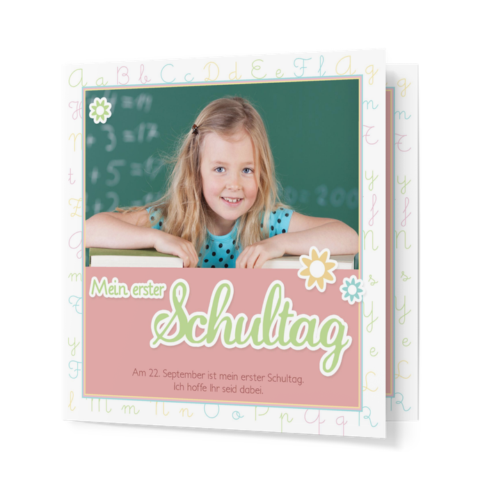 Ab jetzt lernt Ihre Tochter Lesen, Rechnen und Schreiben. Mit der zauberhaften Wunderkarte Mein Erster Schultag in Rosé kann Ihre Tochter alle wichtigen Personen einladen, die diesen Tag mit ihr feiern sollen. Schnell noch ein paar schöne Fotos einsetzen und dann ab zur Post mit der Einladung.