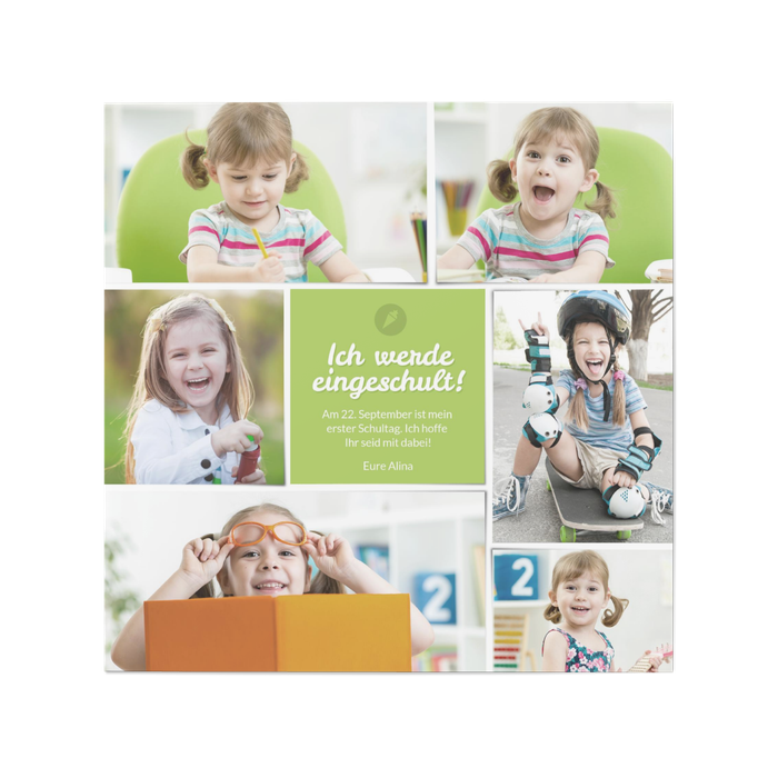 Einladungskarte Einschulung Sechs Bilder in Grün