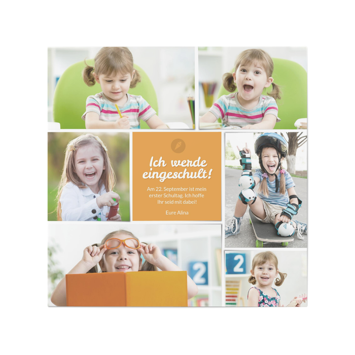 Einladungskarte Einschulung Sechs Bilder in Orange