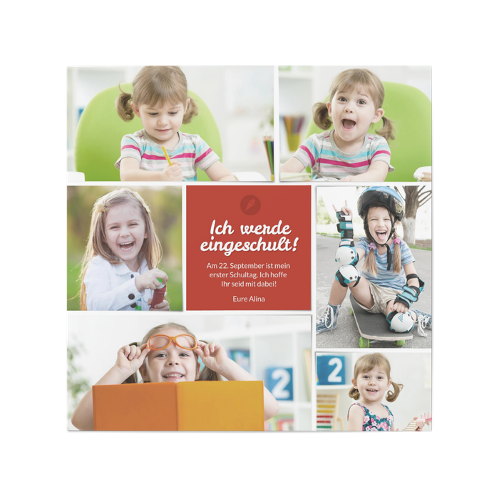 Einladungskarte Einschulung Sechs Bilder in Rot