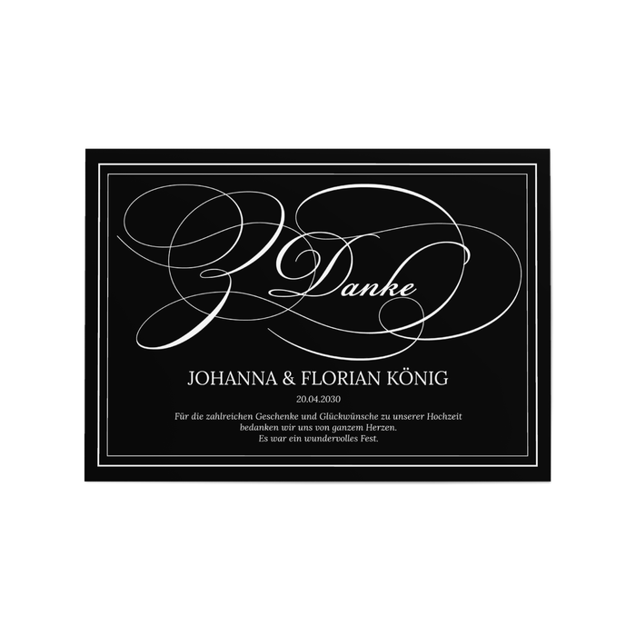 Bei der Hochzeitsfeier erhält man viele Geschenke und Glückwünsche. Bedanken Sie sich hierfür mit unserer Dankeskarte zur Hochzeit in elegantem Schwarz.