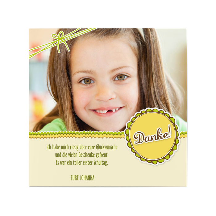 Mit dieser Wunderkarte in grün, können Sie nichts falsch machen. Grün, die Farbe der Hoffnung eignet sich bestens, die Familie und Freunde einzuladen und auf einen guten Schulstart zu hoffen. Damit alle pünktlich zur Einschulung da sind und die Schultüte sich rasch und prall füllt, wurde diese Karte speziell für Sie und diesen einmaligen Anlass von uns entworfen.