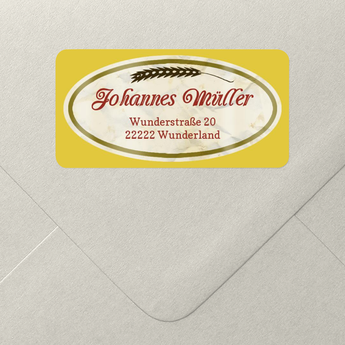 Der lustige Adressaufkleber im Stil Bieretikett in Gold. Durch die Gerstenähre an der Oberseite des Etiketts wird ein klarer Bezug zum Bier hergestellt, der durch die goldene Farbe noch unterstrichen wird. Die geschwungene, edle Schrift strahlt Eleganz und Stilsicherheit aus.