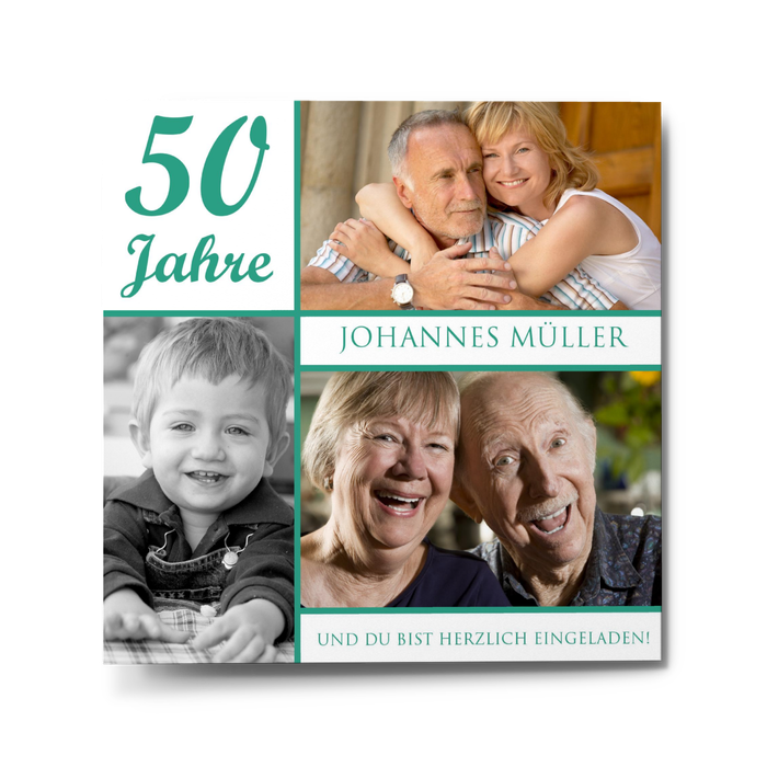 Hier gibt es was zu feiern, denn Sie werden 50 Jahre! Mit der schönen Wunderkarte Erinnerungsfotos in Grün haben Sie die Gelegenheit, Ihren Gästen einen kleinen fotografischen Einblick in Ihr Leben zu geben. Dieser Einladung folgt sicherlich jeder gerne!
