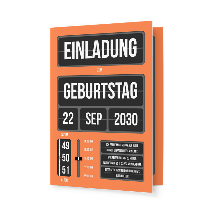 Einladungskarte haben Sie die Wahl zwischen verschiedenen Farbtönen und können per Klappregler sämtliche, relevanten Daten individuell anpassen lassen. Beschränken Sie sich auf das Wesentliche oder fügen Sie zusätzliche Informationen ein. In jedem Fall beweisen Sie mit dieser