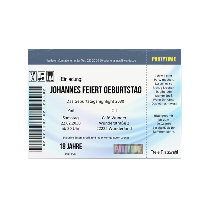 Diese Konzertkarte ist mit Sicherheit eine der ungewöhnlichsten Einladungskarten für den 18. Geburtstag. Schon beim Herausnehmen aus dem Briefkasten werden die Empfänger sicherlich über diese ungewöhnliche Kartenidee schmunzeln - dann aber alle zur tollsten Party des Jahres zusagen. Die Karte ist in Blau, Grün und Pink erhältlich.