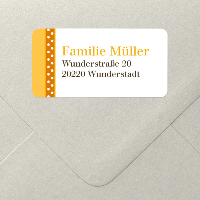 Der Adressaufkleber glänzt mit einem links angeordneten Geschenkband in Orange. Perfekt als Zusatz für Ihre Dankeskarte.