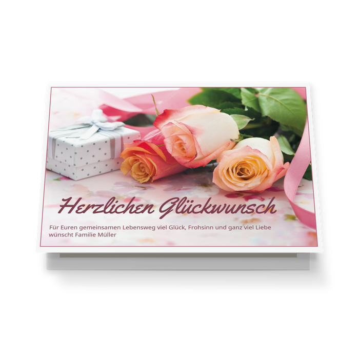 Lassen Sie Blumen sprechen! Die elegante Wunderkarte Rosen lässt alle Herzen höher schlagen. Nutzen Sie die Karte für Ihren eigenen Hochzeitstag, anlässlich der Vermählung von Freunden oder als Geburtstagskarte. Fügen Sie einfach Ihre ganz persönlichen Worte ein - fertig!