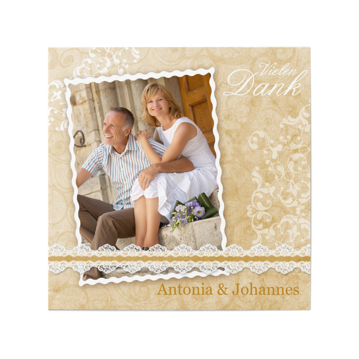 Ihre Goldhochzeit war ein wunderbares Fest? Dann nutzen Sie die elegante Dankeskarte Wahre Liebe, um sich bei all Ihren Gästen zu bedanken. Das stilvolle Design bietet Ihnen genügend Raum für tolle Bilder der Feier, von Ihnen oder auch von Ihren Gästen.