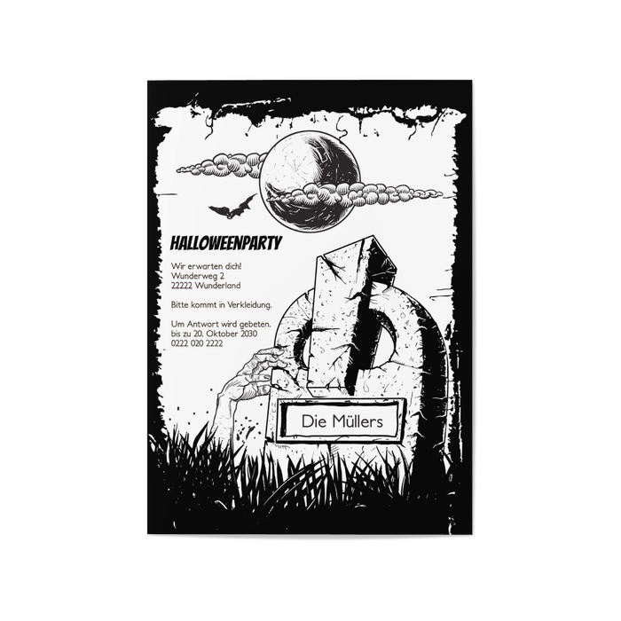 Einladungskarte bringt Ihre unheimlichen Gäste schon in die richtige Stimmung. Mit Ihren persönlichen Einladungszeilen auf Ihrem „Halloween Grabstein“, beerdigen Sie den Alltag und lassen die Monster los.