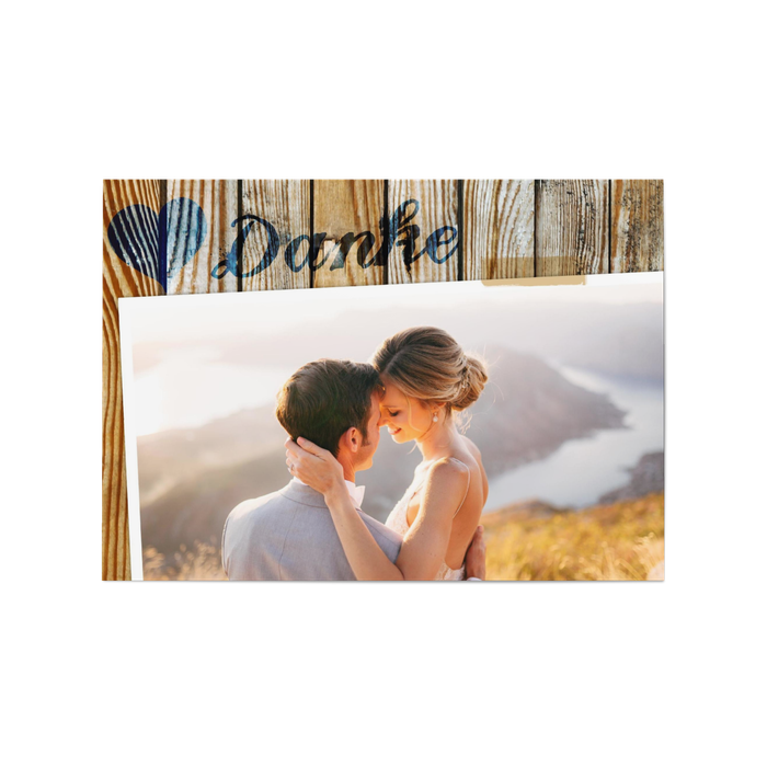 Die ganz besondere Dankeskarte mit dem Thema Landliebe in Blau. Die Karte überzeugt mit ihrer stilvollen und doch rustikalen Optik. Die Vorder- und die Innenseite dieser hochwertigen Klappkarte können ganz frei nach eigenen Wünschen mit Fotos und Nachriten gestaltet werden.