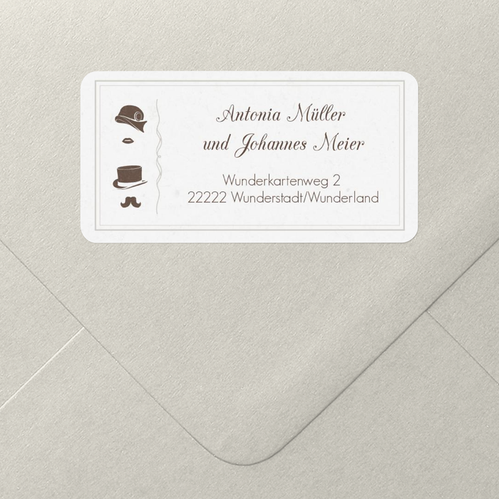 Versehen Sie Ihre Hochzeitseinladung mit einem lustigen Augenzwinkern. Der Adressaufkleber Nostalgie bietet Ihnen die Möglichkeit dazu. Originelle Zeichnungen und feine Linien zaubern einen nostalgischen Touch auf Ihre Post. Der Aufkleber ist die perfekte Ergänzung zur Einladungskarte Nostalgie.