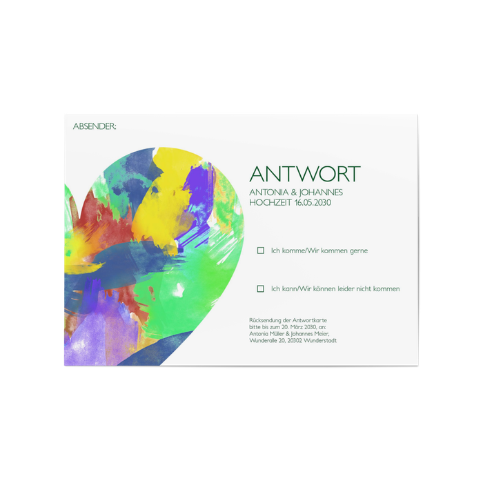 Die Antwortkarte mit dem romantischen Herz in Wasserfarben-Optik fügen Sie einfach Ihrer Einladung bei. Ihre Gäste können die Karte dann einfach an Sie zurück schicken. So wissen Sie genau, mit wie vielen Gästen Sie an Ihrem Hochzeitstag rechnen können. Das schlichte und romantische Design sorgt für Vorfreude auf Ihren Hochzeitstag. Schrift in grün.