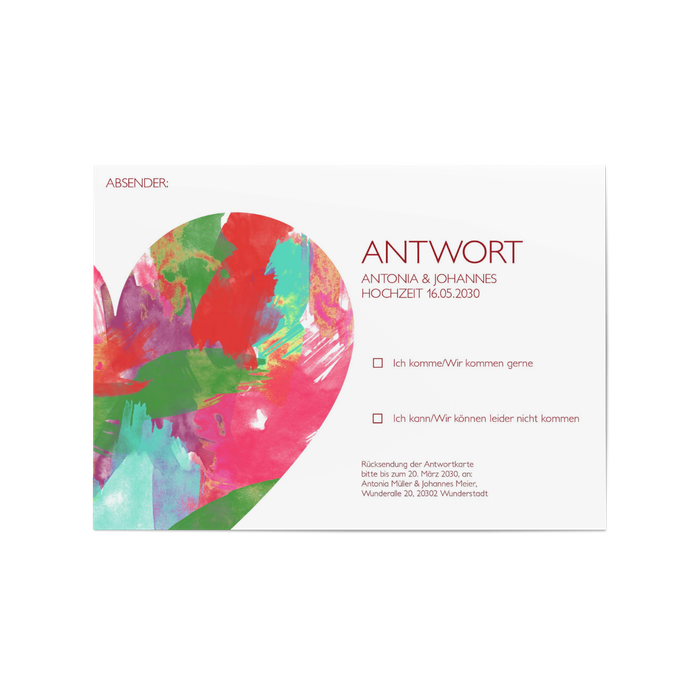 „Ja, wir kommen gerne!“ Fügen Sie diese schlichte Antwortkarte in Wasserfarben-Optik einfach Ihrer Einladung bei. Ihre Gäste schicken die ausgefüllte Karte dann an Sie zurück. So wissen Sie genau, mit wem Sie an Ihrem Hochzeitstag rechnen können. Bei diesem romantischen Design werden Freunde und Familie ganz bestimmt zusagen! In roter Schrift.