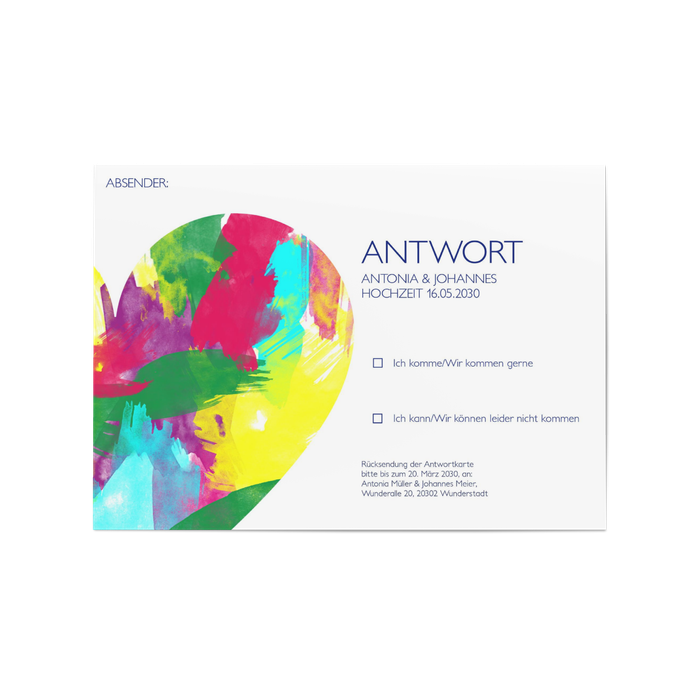 Antwortkarte mit romantischem Herz in Wasserfarben-Optik. Statt Kitsch setzt diese Karte ganz auf Natürlichkeit und Romantik. Fügen Sie die Karte Ihrer Einladung bei, um genau zu wissen, mit wie vielen Gästen Sie an Ihrem Hochzeitstag rechnen können! Ihre Gäste schicken die Karte dann einfach an Sie zurück.