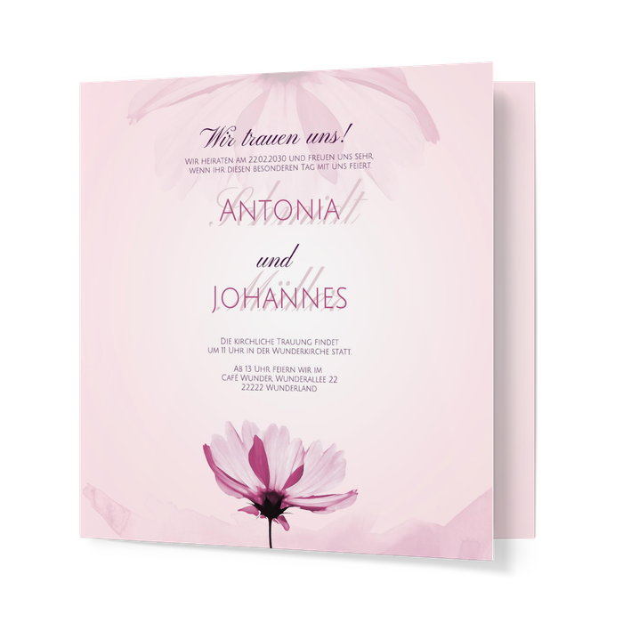 Eine Hochzeitseinladung verlangt weiche Farben und Formen. Die zarte Blume in Rosa entspricht genau dieser Anforderung und wird abgerundet mit einem Foto des Brautpaares.