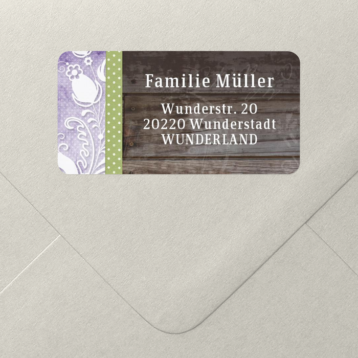 Ein hübsches Blumenmuster auf einem lilafarbenen Hintergrund ziert die linke Seite dieses Adressaufklebers, der sicher alle Blicke auf sich ziehen wird. Denn Ihr Name wirkt hier wie auf Holz gepinselt, und ist so ein absolutes Highlight! Nun ist sicher jeder neugierig auf den Inhalt, und wenn Sie mit diesem genauso beeindrucken wollen, dann kombinieren Sie dazu die Karte „Ihr seid wunderbar in Lila“.