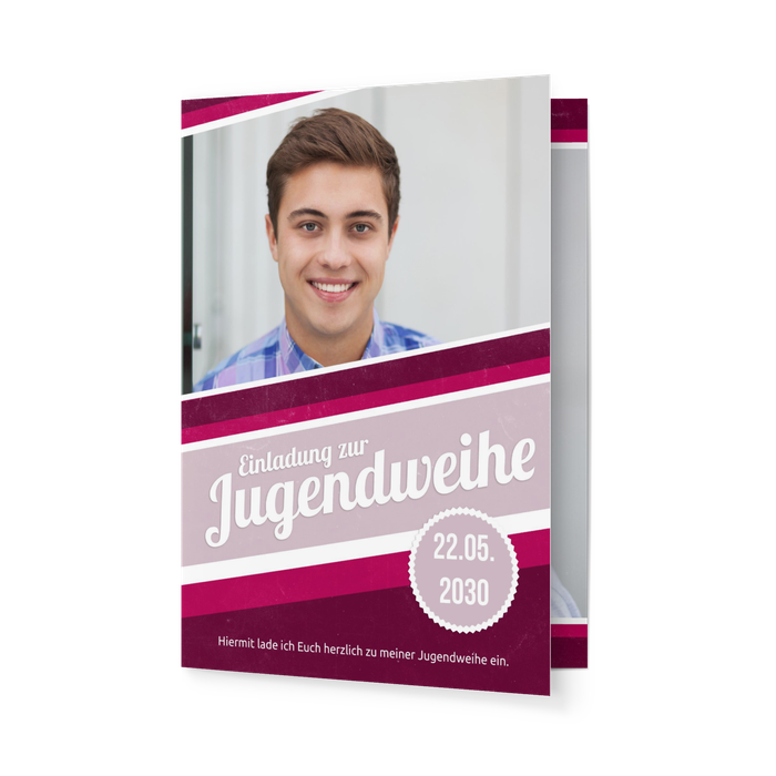Die stilvolle Einladungskarte mit Retrostreifen in Bordeaux. Die Klappkarte besticht durch ihre edle Verarbeitung und die Möglichkeit, sämtliche Bilder und Texte zu individualisieren. Auch sind verschiedene Farbgestaltungen möglich, sodass die Karte individuell an den jeweiligen Geschmack und Anlass angepasst werden kann.