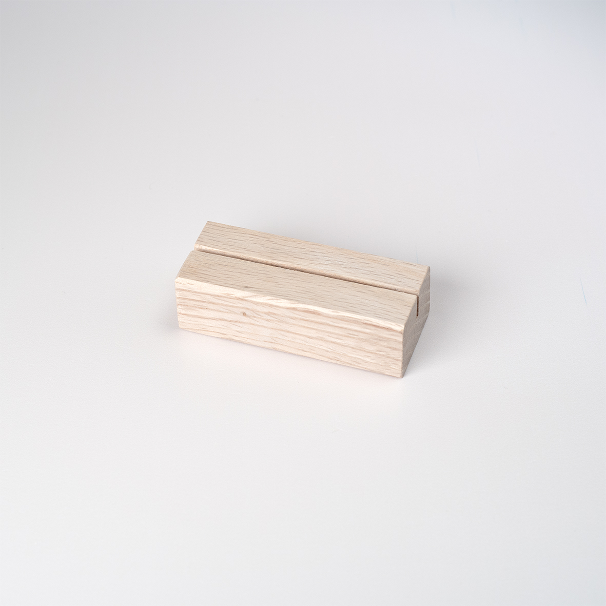 Eikenhouten kaarthouder. Formaat: 7 cm (lengte) x 3 cm (breedte) x 2 cm (hoogte). De gleuf is 2 mm breed.