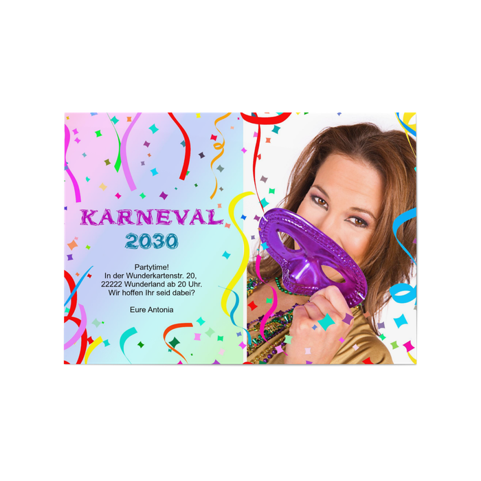 Bunte Luftschlagen und Konfetti verbreiten sofort Partystimmung – passend zum Karneval. Ihre Gäste können Sie mit dieser Einladungskarte nicht nur einladen, sondern auch gleich in die richtige Stimmung bringen.
