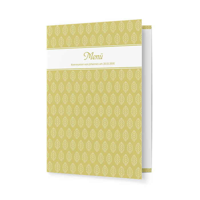 Die Kommunion – ein ganz besonderes Ereignis der Jugend. Mit Frische und Fröhlichkeit begehen Sie und Ihre Familie diesen Tag und geben diesem Ereignis einen besonderen Rahmen. Das frische und frohe Design dieser Menükarte, der warme Gelbton mit weißen, feinen Blättern beschert Ihren Gästen eine wirklich frühlingshafte Kommunionstafel.