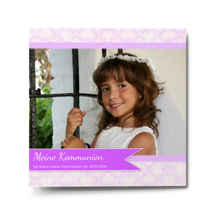 Dem Tag der 1. Heiligen Kommunion fiebert jedes Mädchen entgegen. Mit dieser Wunderkarte Banderole in Lila wird das Ereignis noch festlicher. Die liebevoll gestaltete Karte besticht mit ihren zarten Mustern und bietet genug Platz für die persönliche Anrede. Da kommt die Familie gern!