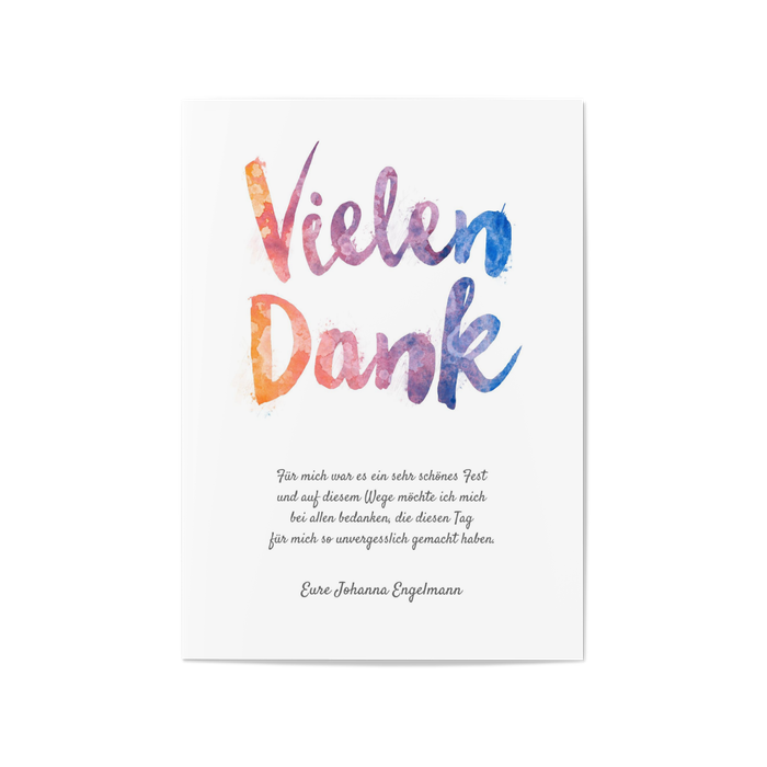 Die Danksagungskarte „Aquarellschrift“ bietet Ihnen hierfür die passende Gelegenheit. Schwungvoll und ausgestattet mit farbenfrohen Lettern integriert Ihre Danksagung zur Kommunion Ihre individuellen Gestaltungsideen und -wünsche.