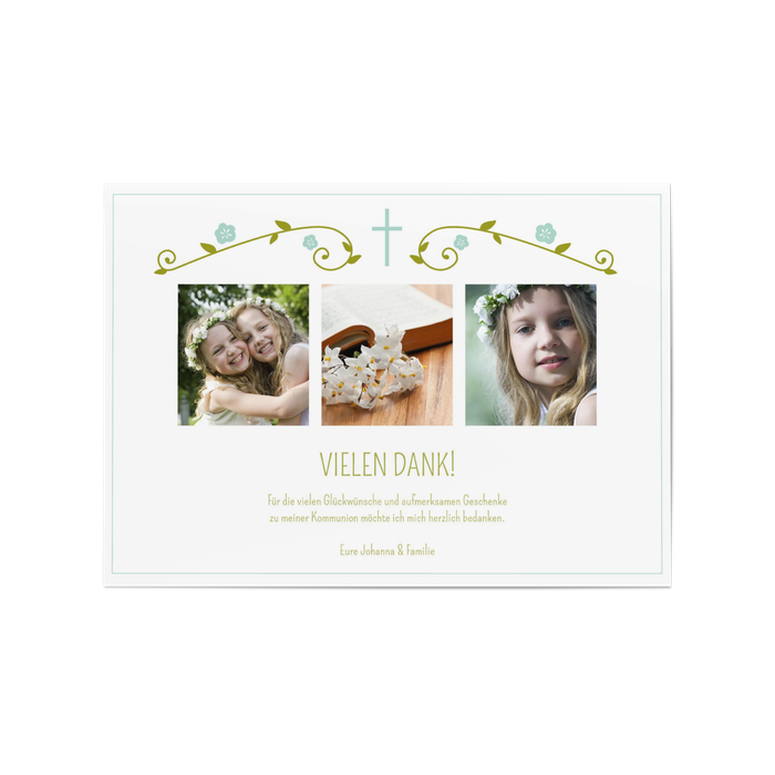 Setzen Sie Ihr Dankeschön doch ganz in das Zeichen der Blume. Mit einer Blütengirlande und Ihren individuellen Gestaltungsideen auf der Dankeskarte zur Kommunion bedanken Sie sich auf eine besonders wertschätzende und originelle Weise. Dank unseres kinderleicht zu bedieneden Karteneditors können Sie und Ihr Kommunionskind spielerisch verschiedene Gestaltungsvarianten ausprobieren „ bis alle rundum zufrieden sind und eine Menge Spaß am Basteln hatten!