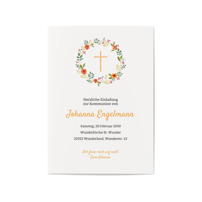 Kartenmotiv „Floraler Kreis“ vermittelt auf einen Blick, worum es geht. Das heilige Kreuz, umrandet von Blumen, stimmt sowohl Gäste als auch die „Erstkommunionisten“ auf den feierlichen Moment der Eucharistie ein und zeigt unaufdringlich und zugleich markant, wohin die Reise geht. Setzen Sie mit dem