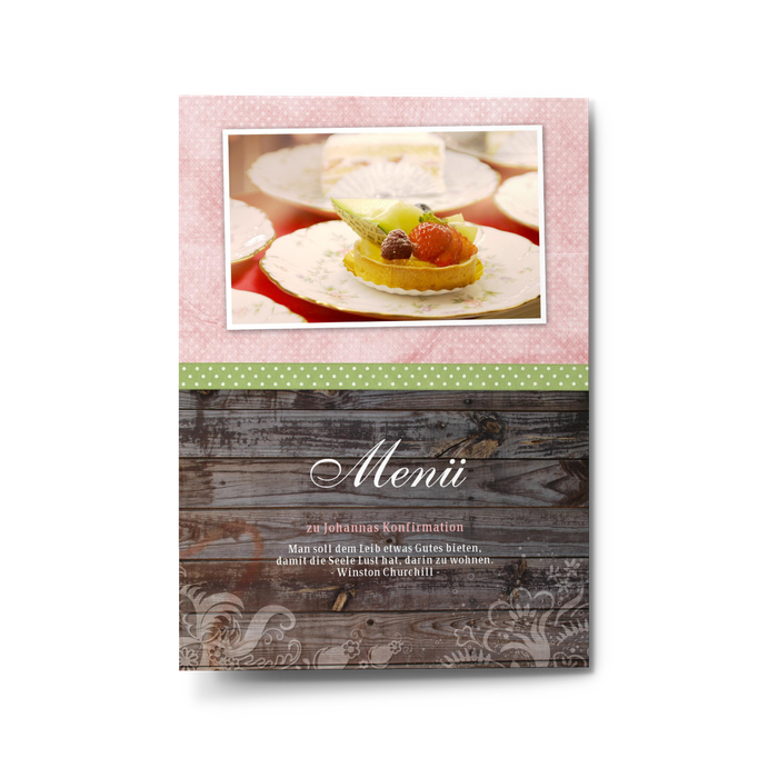 Warme und freundliche Farben verbinden sich auf der Menükarte Wunderbare Konfirmation in Rot mit dem rustikalen Charme alter Eichenbretter. Durch diese einzigartige Kombination wirkt die Karte 100% stilsicher. Sämtliche Foto- und Textfelder können individuell angepasst werden. Neben Rot ist die Karte auch in Blau, Grün, Gelb und Lila erhältlich.