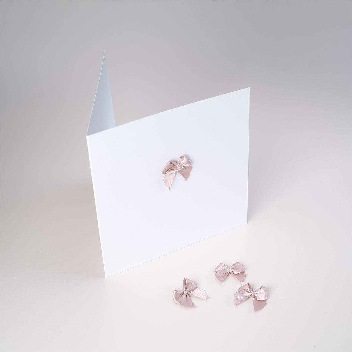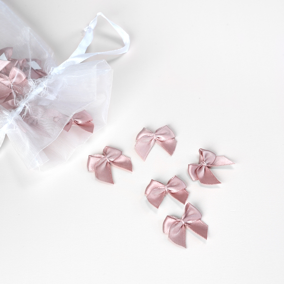 Oudroze satijnen strikjes met plakstrip (25 stuks). Formaat: 2,5 cm (breedte) x 2,5 cm (hoogte).