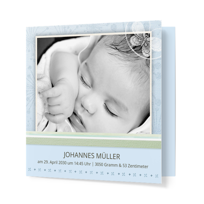 Zart wie das noch junge Glück mit Ihrem kleinen Sohn ist das Pastellblau, das der Grundton für diese süße Fotokarte ist. Endlich können Sie dieses winzige Wesen in Ihren Armen halten! Mit dieser Karte können Sie ihn der ganzen Welt zeigen.