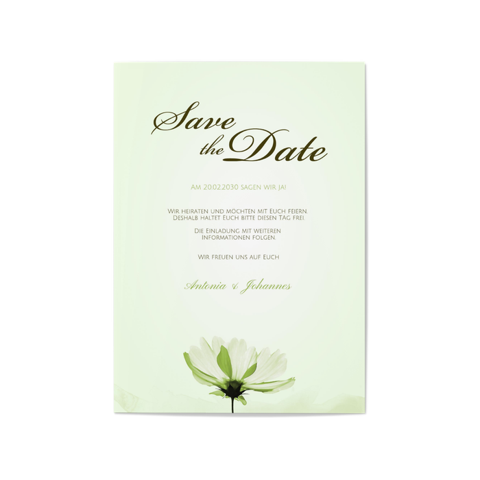 Über eine Einladung mit einer zarten Blume in Grün, die den Einladungstext kunstvoll verziert, wird sich jeder Gast freuen.