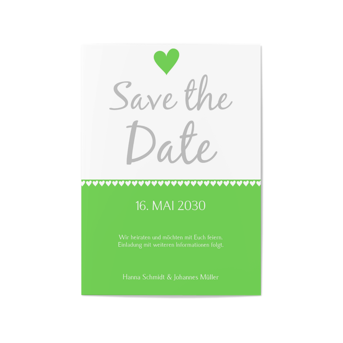 Wichtige Ereignisse kann man nie früh genug ankündigen, so wie Ihre Hochzeit. Mit der zauberhaften Wunderkarte Save the Date Herzen in Grün teilen Sie Ihren Gästen auf charmante Weise bereits vor der eigentlichen Einladung Ihren Hochzeitstermin mit. Da sagt sicher niemand Nein!