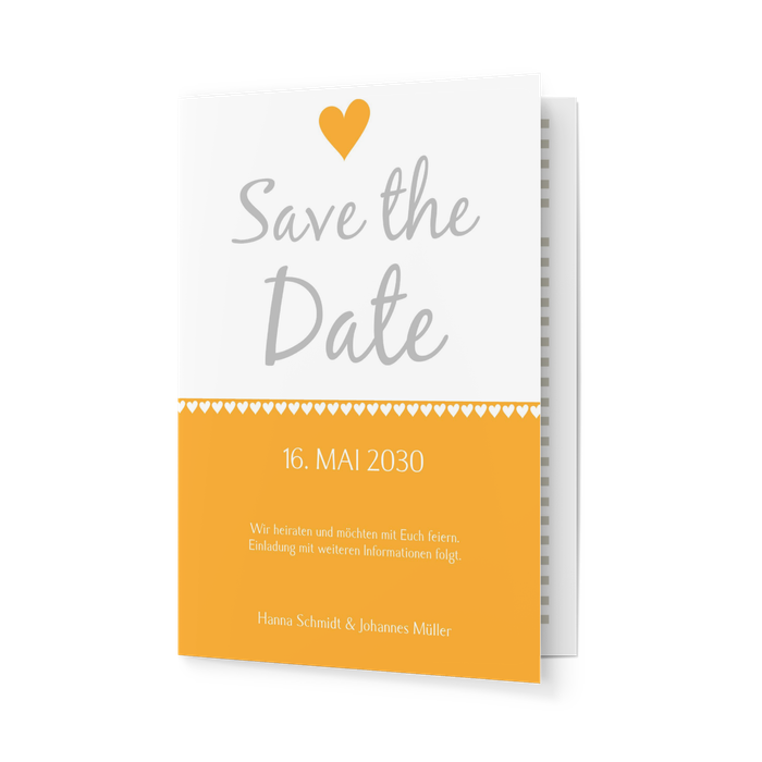 Vorfreude pur verschicken Sie mit dieser fröhlichen Wunderkarte Save the Date Herzen in Orange an Ihre Familie und Freunde. Nutzen Sie diese Karte, um vor der eigentlichen Einladung bereits über Ihren Hochzeitstermin zu informieren. So können sich alle noch länger auf das anstehende Fest freuen.